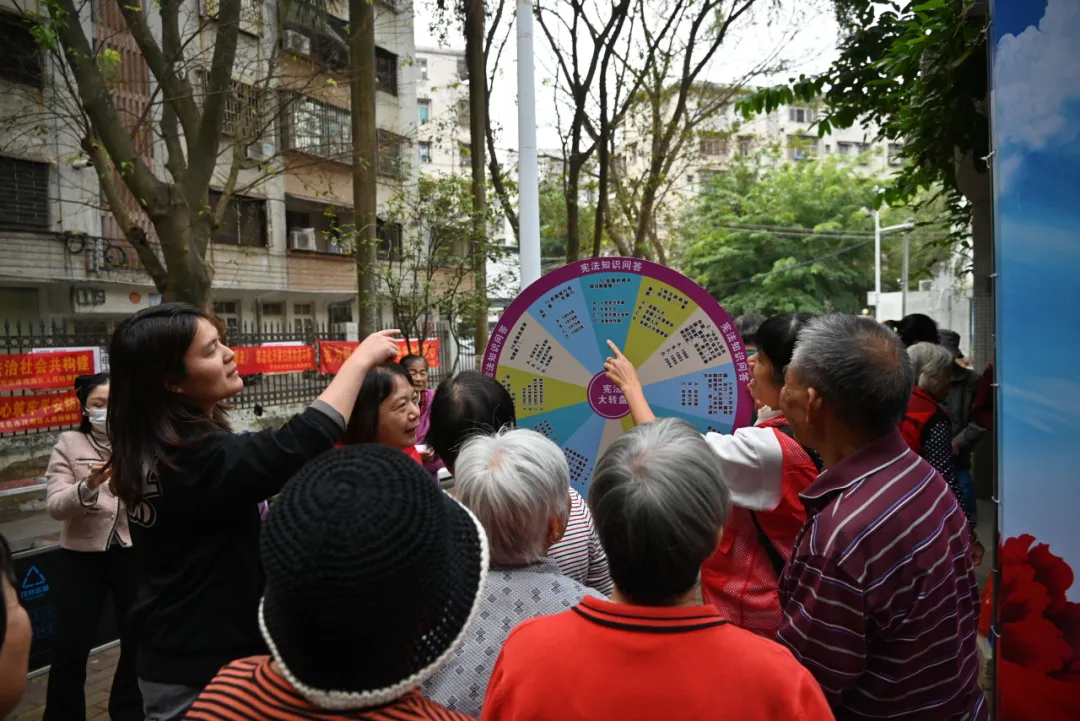 活动现场,检察干警与街道工作人员通过设置宣传展板、发放普法手册、提供法律咨询、开展知识竞赛等形式,向过往民众普及宪法核心要义、公民基本权利义务等知识。工作人员精心设计的涵盖基础法律常识和宪法知识的题库小转盘前,热情高涨的社区群众已经排起了长队。“阿姨您知道《中华人民共和国宪法》里规定的我国根本制度是什么吗?”“叔叔您知道我们人民行使国家权力的机关是什么吗?”社区群众积极融入竞赛问答活动中,在愉快又活泼的氛围中热烈讨论,小声互相交流着宪法知识。