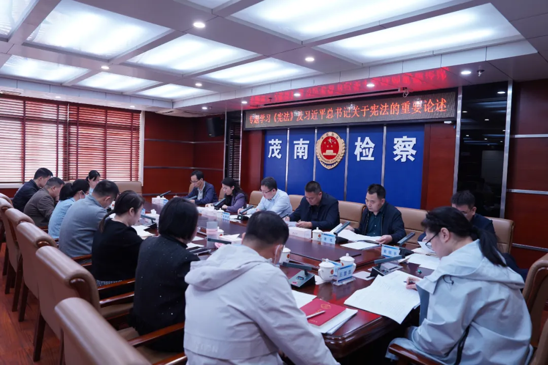 为将宪法学习宣传融入检察工作日常,深化宪法精神与检察履职融合,茂南区检察院组织召开工作会议,专题学习《宪法》及习近平总书记关于宪法的重要论述。与会干警结合办案实践深入研讨,聚焦宪法确立的“社会主义法治原则”“法律面前人人平等”等核心原则,探索将其具体落实到每一起司法案件、每一项法律监督工作的实践路径。