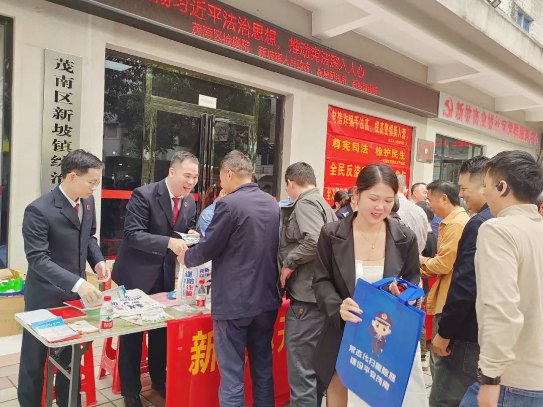 为将宪法知识送到群众身边,营造尊崇宪法、学习宪法、遵守宪法、维护宪法、运用宪法的浓厚氛围,茂南区检察院派出普法队伍分别到新坡镇、河东街道,与当地相关部门开展形式多样的宪法宣传活动。活动现场,检察干警通过悬挂横幅、设点摆摊、派发普法宣传单及小礼品的形式,用通俗易懂的语言向群众讲解宪法中与公民日常生活息息相关的条款,耐心解答群众关于法律方面问题的咨询。同时,结合具体案例宣传与未成年人保护法、反电信网络诈骗、抵制酒驾、扫黑除恶、反邪教、禁毒等相关法律法规知识,引导市民群众坚定宪法自信、弘扬宪法精神、维护宪法权威,增强尊法、学法、守法、用法意识。